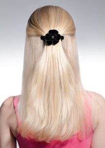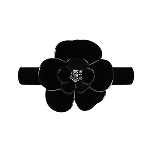 Add a touch of sophistication to your hairstyle with the Camellia Crystal Medium Black Hair Clip, adorned with a graceful camellia flower. Perfect for securing ponytails or half-up styles, its strong fastening ensures a comfortable and secure hold all day long. Expertly handcrafted in France from premium Italian cellulose acetate, it is meticulously hand-set by our skilled artisans with Swarovski crystals and delicate micro beads.