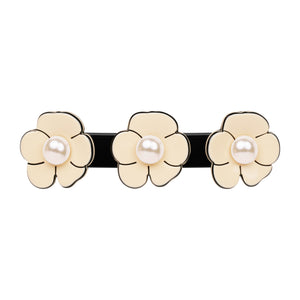Add a touch of sophistication to your hairstyle with the Camellia Triple Pearl Small Ivory Hair Clip, adorned with delicate camellia flowers. Perfect for securing ponytails or half-up styles, its strong fastening ensures a comfortable and secure hold all day long. Expertly handcrafted in France from premium Italian cellulose acetate, it is meticulously hand-set by our skilled artisans with Swarovski pearls.