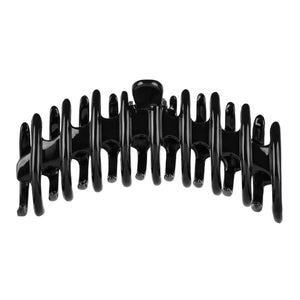 The Christina Large Black Claw Clip, made from durable cellulose acetate, features a covered spring and a sleek, lacquer-coated finish. It is designed to securely hold long, thick hair with ease.