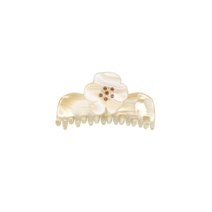 Secure your hair in style with the Camellia Crystal Small White Alba Claw Clip, featuring delicate camellia flowers. Suitable for all hair types, its strong spring provides a comfortable, secure hold throughout the day. Expertly handcrafted in France from premium Italian cellulose acetate, it is meticulously hand-set by our skilled artisans with Swarovski crystals and delicate micro beads.