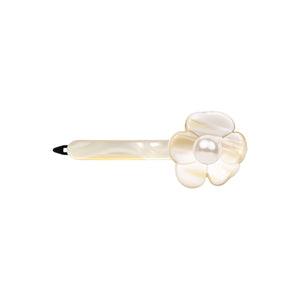 Elevate your everyday look with the Camellia Pearl Large White Alba Side Hair Clip — a perfect blend of elegance and functionality. Designed to effortlessly transition from casual to formal occasions, this versatile clip is ideal for pinning back side sections, taming bangs, or adding a polished touch to half-up hairstyles. It keeps shorter strands in place while adding a subtle yet sophisticated accent to your look. Crafted for a secure and comfortable hold, the clip gently grips the hair without pulling or snagging, making it suitable for all hair types. Expertly handcrafted in France from premium Italian cellulose acetate, it is meticulously hand-set by our skilled artisans with a Swarovski pearl.