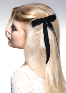 Enhance your hairstyle effortlessly with our exquisite Deneuve Small Black Bow Barrette. Meticulously handcrafted from premium double-faced velvet employing Haute-Couture techniques, this classic bow exudes opulence. Its French-made gold-plated fastening not only imbues your look with elegant volume but also lends a polished allure to any high half updo or ponytail.