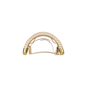 The Tressa Ivory Ponytail Barrette is meticulously designed to elevate your ponytail with timeless elegance. Crafted from French haute couture tresses fabric, this clip is a masterpiece woven by skilled artisans on wooden looms, showcasing a subtle shine and the intricate beauty of robust braids. This luxurious fabric, with its rich heritage, is paired with a high-quality, gold-plated metal clip, ensuring a secure and comfortable hold without exerting pressure on your hair. Perfectly versatile, this hair clip effortlessly complements both casual and formal outfits, making it an exquisite addition to any wardrobe.